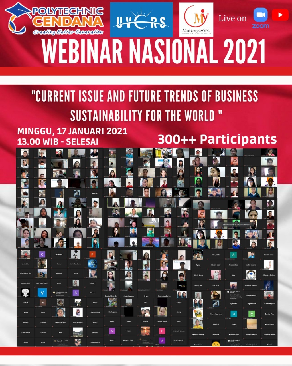 Webinar Nasional 2021 Kerjasama Politechnic Cendana Medan, UVERS Batam, dan STAB Maitreyawira Pekanbaru dengan tema Current Issue and Future Trends of Business Sustainability For The World yang dilaksanakan pada :