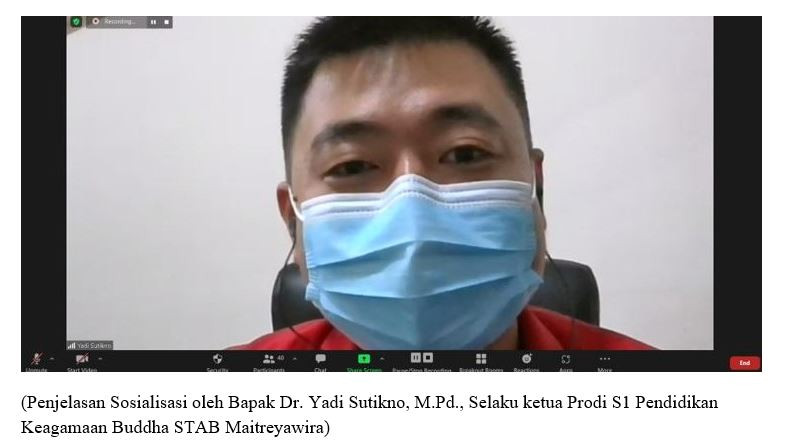 Dilanjutkan dengan Sosialisasi oleh Bapak Dr. Yadi Sutikno, M.Pd. selaku Ketua Prodi S1 Pendidikan Keagamaan Buddha STAB Maitreyawira, beliau dalam kesempatan tersebut menjelaskan mengenai Promosi STAB Maitreyawira, prosedur masuk STABM, biaya pendidikan, sistem perkuliahan, suasana akademik yang telah diterapkan oleh STAB Maitreyawira, serta peluang pekerjaan yang tersedia bagi lulusan STAB Maitreyawira.