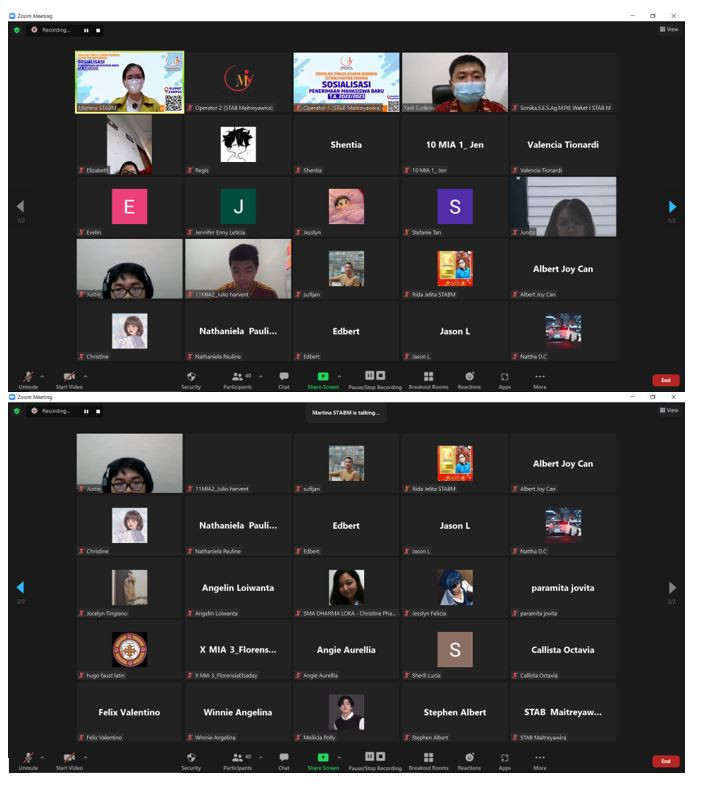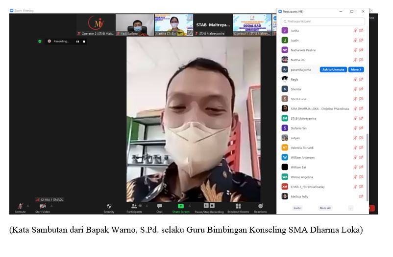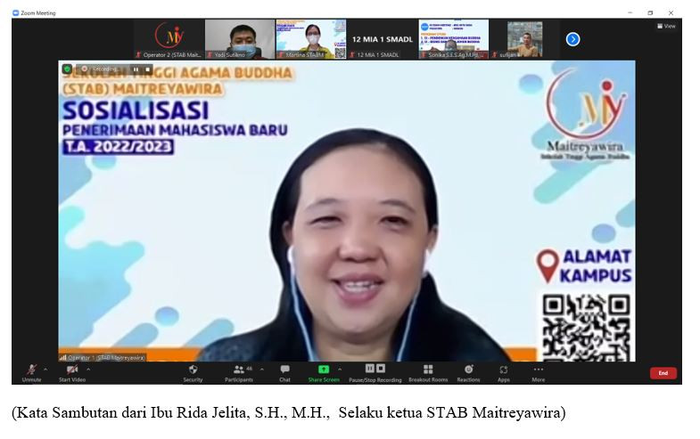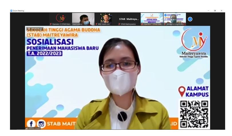 Pada Hari Rabu, Tanggal 05 Maret 2022, STAB Maitreyawira melaksanakan Sosisalisasi Penerimaan Mahasiswa Baru Tahun Akademik 2022-2023 dengan Tenaga Pendidik beserta Peserta didik SMA Dharma Loka , via Zoom meeting, adapun susunan acaranya adalah sebagai berikut :